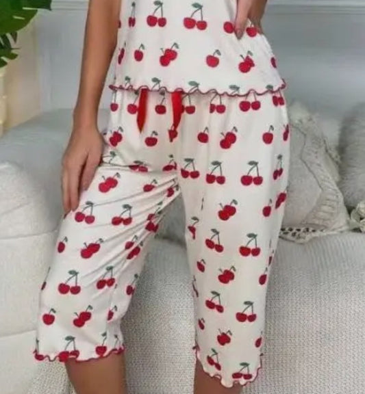White Cherry Pajama Tank Top And Cropped Pants Set