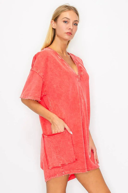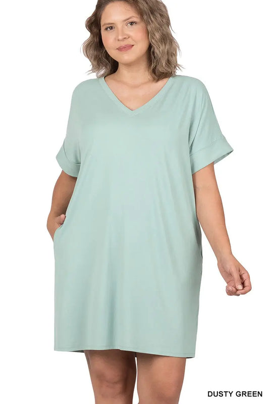 Zenana Plus Size Rolled Short Sleeve V-neck Mini Dress