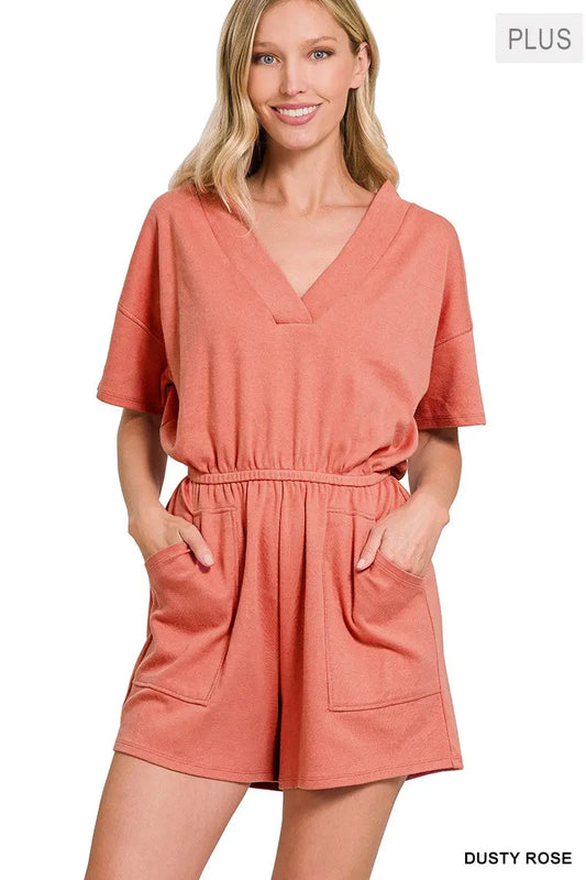 Zenana Plus Size V-neck Romper With Pockets
