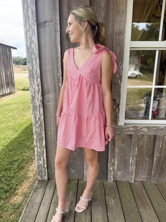 Red Plaid Bow-Strap V-Neck Ruffled Mini Dress