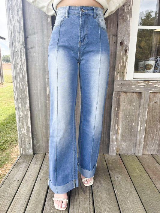 Western Cowboy Inspired Straight Leg Medium Wash Cuff Jeans