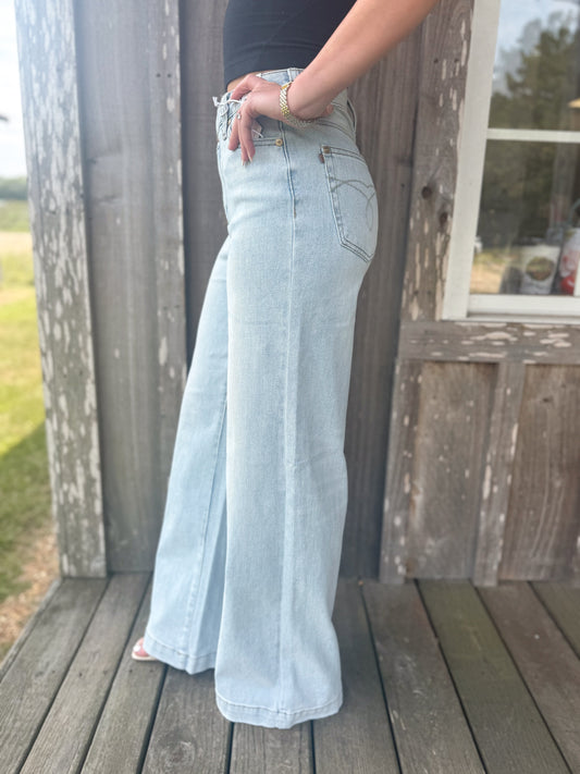 Judy Blue High Waist Retro Wide Criss-Cross Waistband Mild Destroy Jeans