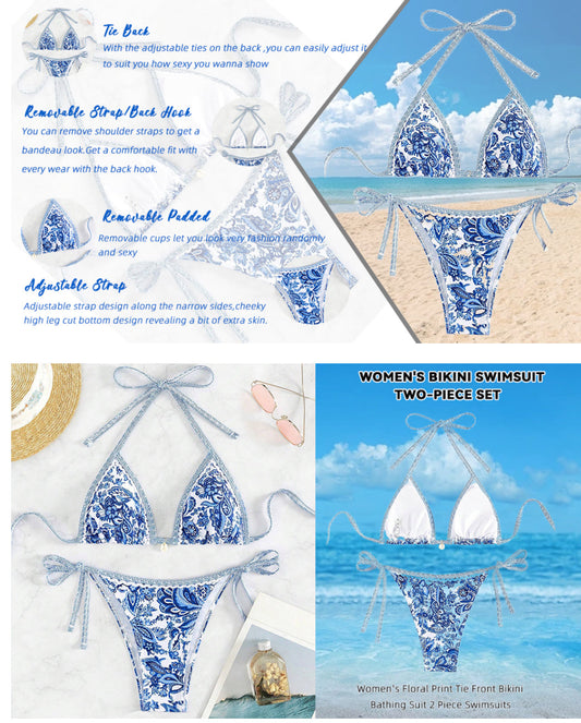 Blue Bohemian Print Lace-Up Sexy Bikini Split Swimsuit Set