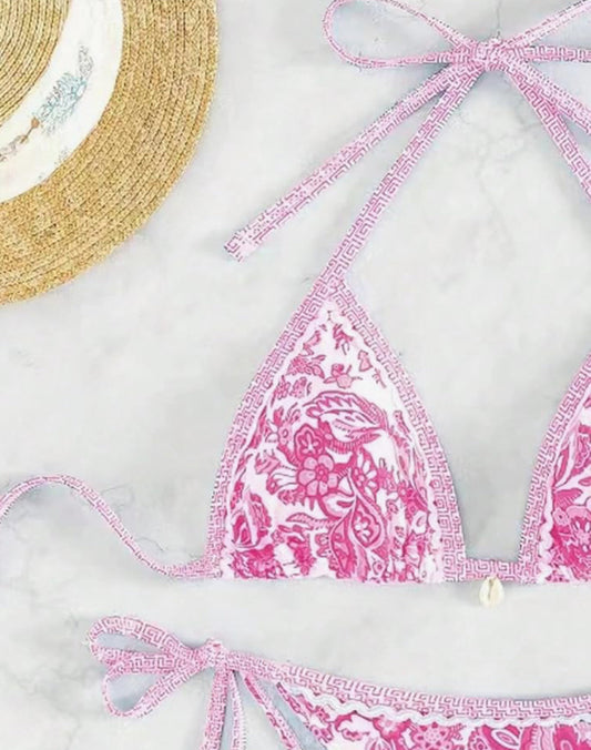 Pink Bohemian Print Lace-Up Sexy Bikini Split Swimsuit Set