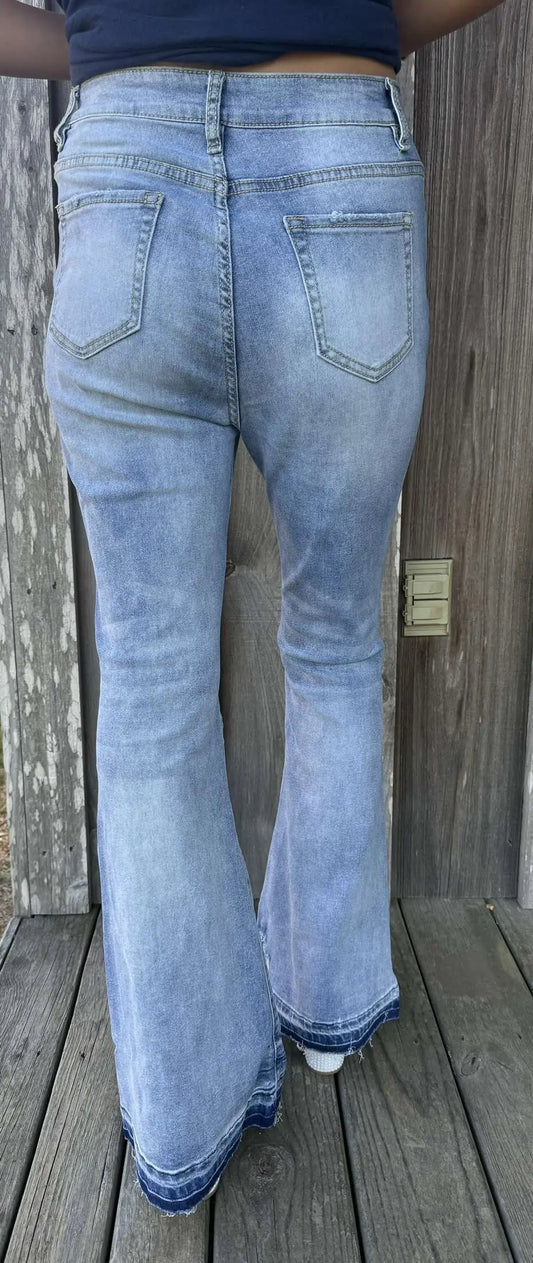 Umorger Denim Blue High Waist Buttoned Distressed Flared Jeans