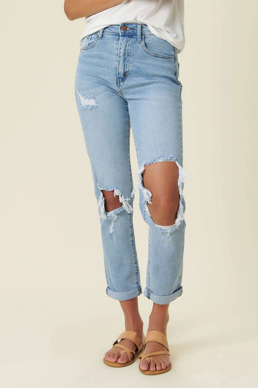 Vibrant MIU High Rise Distressed Light Wash All to Me Mom Denim Jeans