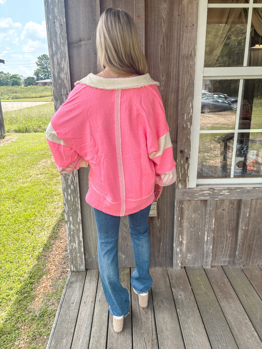 BUCKETLIST Neon Pink French Terry Knit Color-block Collared Tunic Top