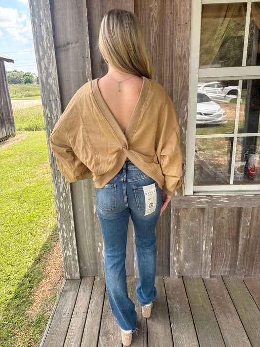 BUCKETLIST Taupe Reversible Twist-Front Washed Terry Sweatshirt Top